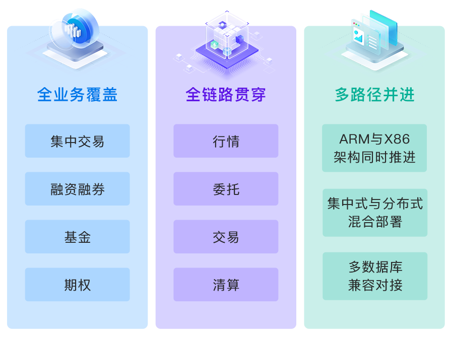 目前,行业内核心交易系统的信创建设工作均处于探索阶段,东吴证券在此方面始终走在前列。为了验证技术方案的可行性、兼顾功能实现与性能达标,项目组采用了多样化的技术路径,同时验证比较,取长补短,择优采纳。在服务器选择方面,X86架构服务器上应用迁移过渡较为简单平缓,系统稳定;而ARM架构服务器则性能更为突出,但存在一定的适配验证工作。项目组权衡利弊,以X86架构为稳定托底方案,同时不断优化ARM架构方案,力争系统上升到新的性能阶段。数据库方面,为了应对产业侧百花齐放、高速发展的现状,A5系统摒弃了对单一数据库的依赖,采用灵活开放但又相对收敛的设计思路,同时兼容一系列主流国产数据库,满足未来系统升级发展需要。同时,项目组还根据A5系统特点,采用集中式与分布式混合部署方式,以发挥数据库的最大功效。