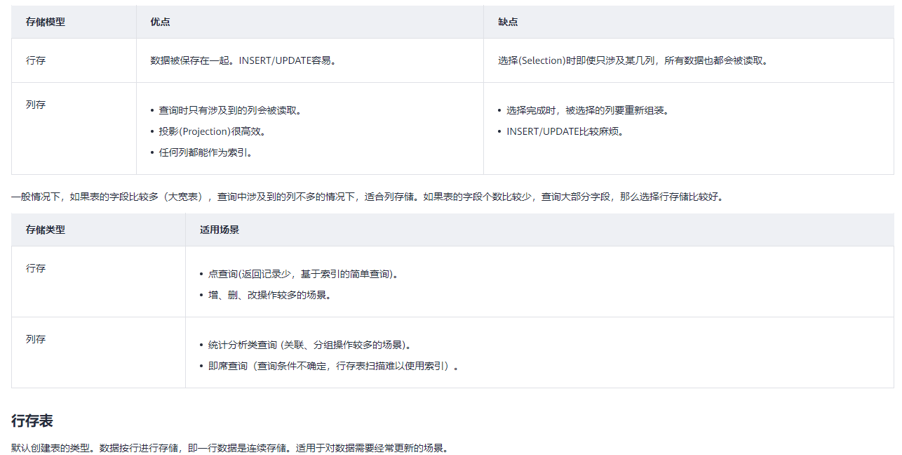 GaussDB支持行列混合存储。行、列存储模型各有优劣,建议根据实际情况选择。