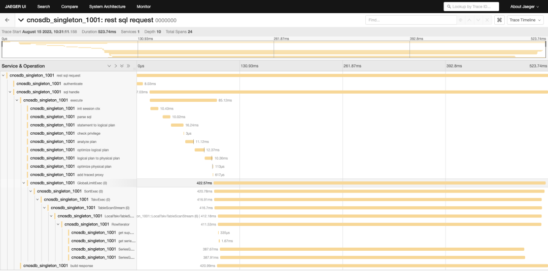 利用详细的时间记录,你可以精确地分析查询语句的性能。在正式的生产环境中,这将成为优化查询语句和改进系统性能的宝贵工具。通过分析每个 span 的执行时间,你可以找到可能导致延迟的步骤,从而采取针对性的优化措施。