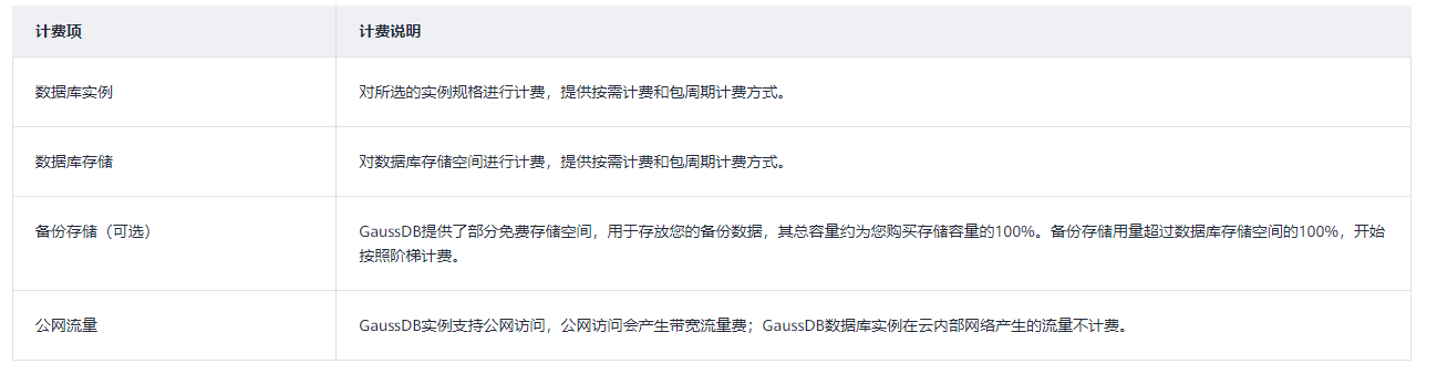 GaussDB对您选择的数据库实例、数据库存储和备份存储(可选)收费。