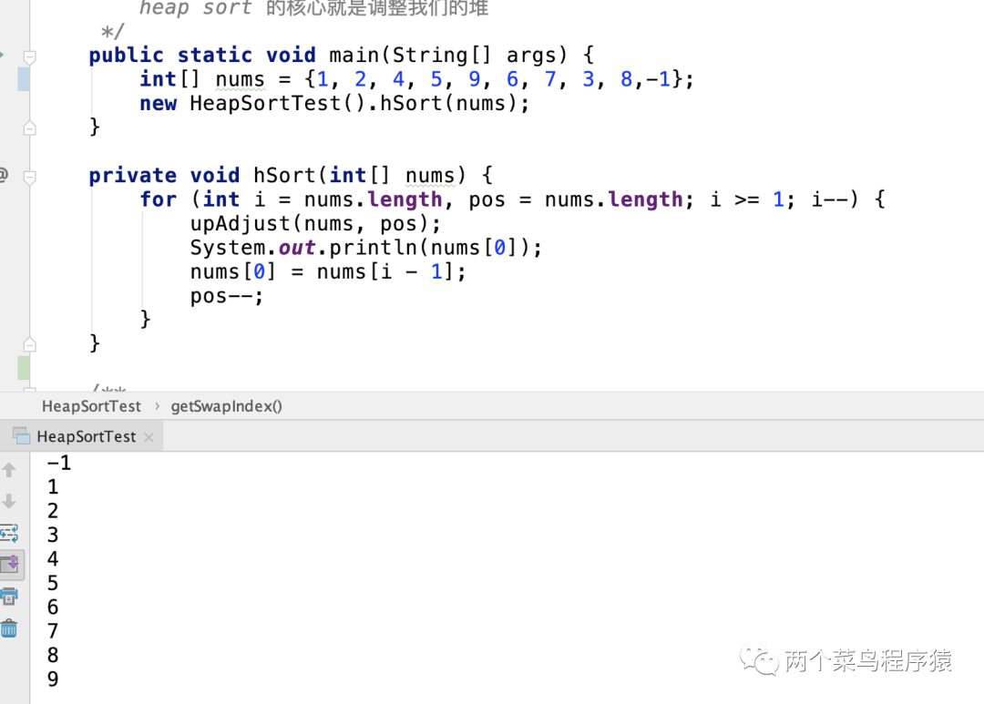 /*** 堆排序** @author :breakpoint/赵立刚* @date : 2020/07/09*/public class HeapSortTest {/*heap sort 的核心就是调整我们的堆*/public static void main(String[] args) {int[] nums = {1, 2, 4, 5, 9, 6, 7, 3, 8,-1};new HeapSortTest().hSort(nums);}private void hSort(int[] nums) {for (int i = nums.length, pos = nums.length; i >= 1; i--) {upAdjust(nums, pos);System.out.println(nums[0]);nums[0] = nums[i - 1];pos--;}}/*** 调整为小根堆** @param nums 数值* @param pos 最后的位置*/private void upAdjust(int[] nums, int pos) {int index = pos / 2;// 进行调整while (index >= 1) {int swapIndex = -1;if ((swapIndex = getSwapIndex(nums, index, pos)) != -1) {if (nums[index - 1] > nums[swapIndex - 1]) {int temp = nums[index - 1];nums[index - 1] = nums[swapIndex - 1];nums[swapIndex - 1] = temp;}}index--;}}// 获取交换位置private int getSwapIndex(int[] nums, int index, int pos) {int swapIndex = -1;if (2 * index + 1 <= pos) {swapIndex = nums[2 * index] > nums[2 * index - 1] ?2 * index : 2 * index + 1;} else if (2 * index <= pos) {swapIndex = 2 * index;}return swapIndex;}// 向下调整 暂时没有用到@Deprecatedprivate void downAdjust(int[] nums, int pos) {int num = nums[0];int swapIndex = 0;int index = 1;while (swapIndex != -1) {if ((swapIndex = getSwapIndex(nums, index, pos)) != -1) {if (nums[index - 1] > nums[swapIndex - 1]) {int temp = nums[index - 1];nums[index - 1] = nums[swapIndex - 1];nums[swapIndex - 1] = temp;}}index = swapIndex;}nums[index - 1] = num;}}