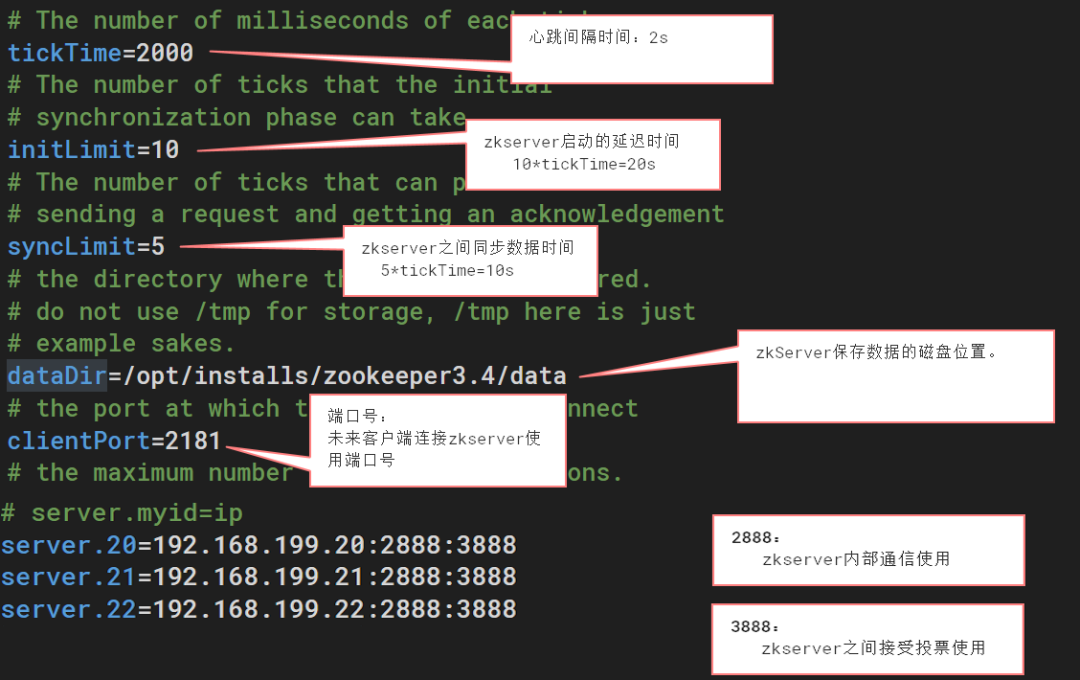 文件,并指定一个zk主机编号,一般用ip为编号100配置zk集群的节点信息