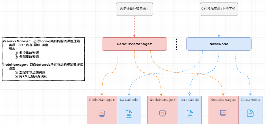 「作用(施工队)」:资源调度、任务监控。主要用来整合Hadoop集群中的资源(CPU、内存)进行统一调度,同时监控任务的执行情况。