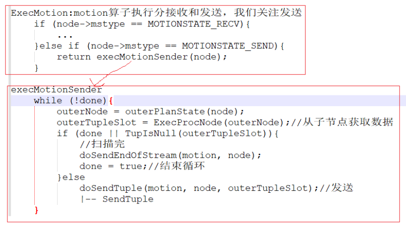 2)execMotionSender会循环从执行计划子节点拉取数据,然后调用SendTuple函数将其发送走,直至所有数据都处理完。