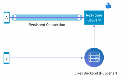 简单架构如下所示,S发送点赞的信息到后端,后端会把这个信息publish出去,然后实时的delivery的系统会把相应的信息发送到已经建立长链接的client端。
