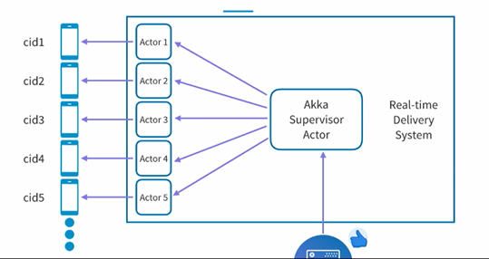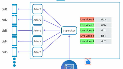 这样一来一个server就可以管理很多connection,当有一个点赞的信息到来的时候,就会发送到一个supervisor actor,然后它会把这个信息分发到不同的actor中,这些actor其实每一个就对应一个和用户端的链接,从而把相应的点赞信息发送给用户端。