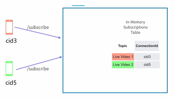 这里当cid3看红色直播的时候会做一个subscribe,然后在server端把这个信息保存到一个mapping的表中,它会记录cid3在看红色直播。同样的也会记录绿色直播是cid5在看。这样一来随着时间的推移系统就会如下所示,当有一个点赞的消息过来了,我们假设是一个绿色直播的点赞,在supervisor这边就可以查询mapping的表格,从而知道需要把这个点赞的内容发送到cid1,cid2和cid5。这样就解决了不同用户端的区分问题。