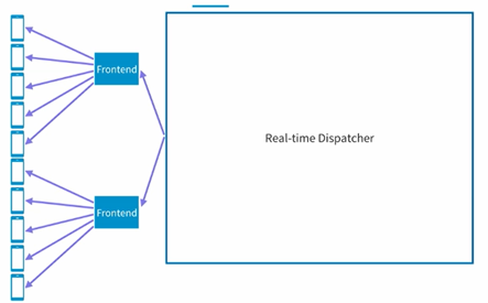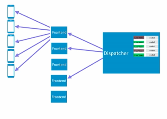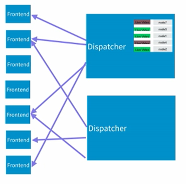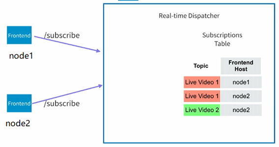 现在还有一个问题需要解决,就是dispatcher是如何知道该把消息发送给哪个frontend,而不是说所有的frontend都发送呢?这个问题的解决方法和上面的不同用户端是类似的,假如我们能够让frontend也向dispatcher subscribe一下它感兴趣的直播视频,那么我们就可以只把相关的消息发送给他就可以了。所以需要在dispatcher端维护一个类似的mapping表,只是这次值不是client端id而是frontend的id而已。