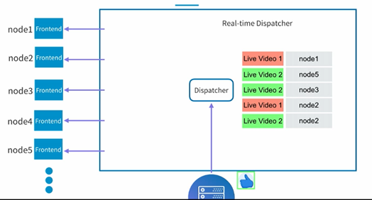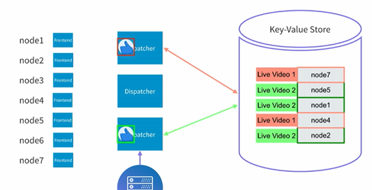 所以这个时候整个流程就变成了,点赞信息发送到某个dispatcher,然后dispatcher会到key-valuestore去看哪些frontend对这个直播感兴趣,从而把相关的点赞信息发送到相关的frontend,frontend收到对应信息之后,再根据它的in-memory的表格决定最终发送到哪一个用户端。从而完成这个发送的流程。