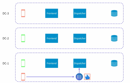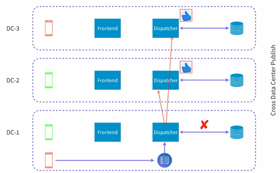 当第一个dispatcher收到信息的时候,它会把这个消息分发给所有的不同的数据中的dispatcher,然后各个dispatcher就可以按照之前的做法来做了。