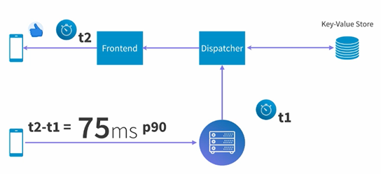 最后我们来看看这个系统中,点赞到最终发送到用户端的延时是怎样的呢?这里测试的数据时间点t1是后端向dispatcher发送点赞的时间点,t2是frontend开始向客户端发送的时间点。这两个时间点之间的延时P90是75ms,还是很快的,当然另外两端和客户端的交互就收到很多不确定的因素影响了,不计入考虑也是可以理解的。