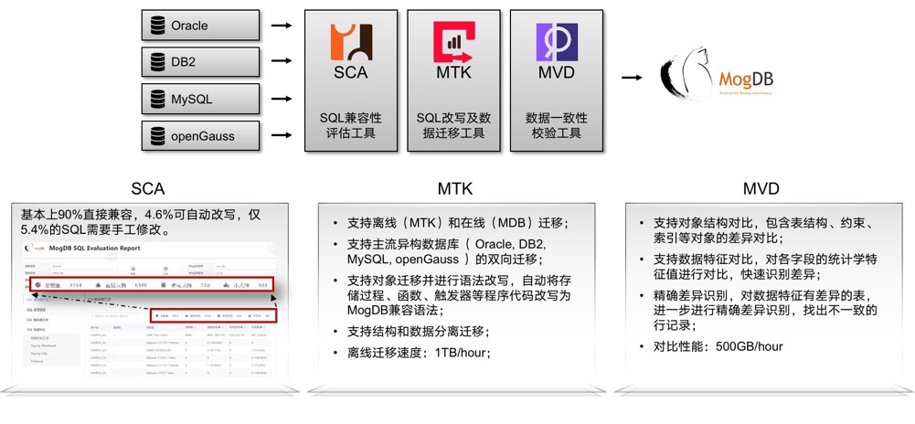 所有改造项目的平稳替代,MogDB 完备的工具链功不可没,无论是迁移前的SQL兼容评估、迁移过程中的异构数据同步,还是迁移后的一致性校验等,都能够实现工具化、自动化。在案例客户的本次试点项目中,94.6%的SQL能够通过工具直接兼容或自动改写,仅5.4%的部分需要手动修改,并且每小时1TB的迁移速度将整个迁移过程大幅缩短,极大地减轻了运维人员的工作负担。