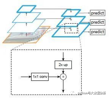 算法大致结构如下:一个自底向上的线路,一个自顶向下的线路,横向连接(lateral connection)。图中放大的区域就是横向连接,这里1*1的卷积核的主要作用是减少卷积核的个数,也就是减少了feature map的个数,并不改变feature map的尺寸大小。