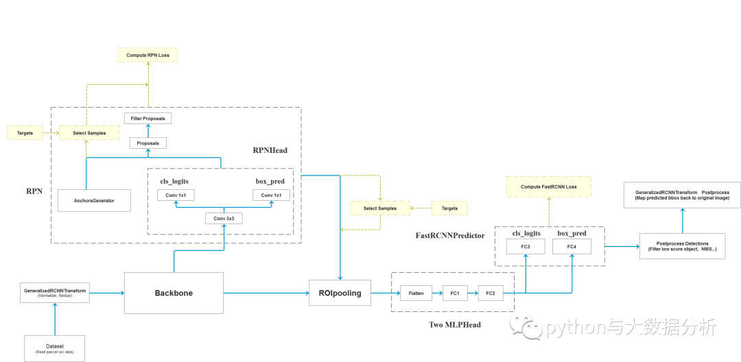 四、RCNN network模块:这一模块主要有两个功能,一方面用多层全连接网络对RoI传入的特征进行分类和回归,以得到预测目标的位置和标签;另一方面计算RCNN的损失,用于更新网络的参数。