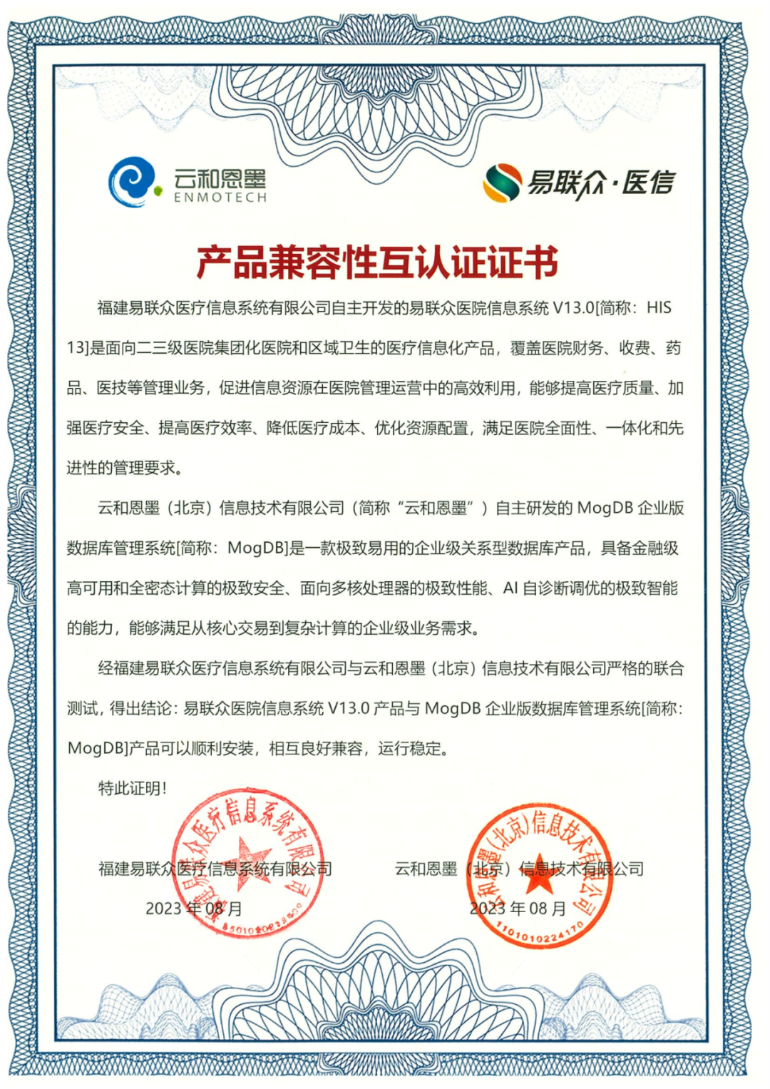 MogDB 是有云和恩墨基于 openGauss 开源内核进行增强提升,研发并推出的一款安稳易用的企业级关系型数据库产品。云和恩墨结合自身十余年的技术沉淀和实践积累,投入一流内核研发团队,将商业数据库的能力带入 openGauss 社区,打造 MogDB 核心竞争力,实现高安全、高性能、高兼容、多场景支持等特性,同时在压缩技术、并行、自治、可观测性、一体机等方向重点创新,达成单机256万tpmC的卓越性能,已助力金融、医疗、电信、制造、政务等行业用户实现核心系统升级。易联众医信作为民生领域数字化解决方案先行者,坚持以数据链为基础,重点围绕“医疗保障、卫生健康、人力资源与社会保障”等民生领域,专注打造全方位的整体解决方案和产品与技术服务体系,致力于以数字化重塑民生健康新生态。HIS 13是面向二三级医院集团化医院和区域卫生的医疗信息化产品,覆盖医院财务、收费、药品、医技等管理业务,促进信息资源在医院管理运营中的高效利用,能够提高医疗质量、加强医疗安全、提高医疗效率、降低医疗成本、优化资源配置,满足医院全面性、一体化和先进性的管理要求。易联众医信与云和恩墨完成产品兼容性互认证后,将进一步加强合作,共同推动生态建设,持续深耕数字化建设,助力医疗行业用户向数据驱动业务的新形态进化,让未来的“医数”更高明!数据驱动,成就未来,云和恩墨,不负所托!