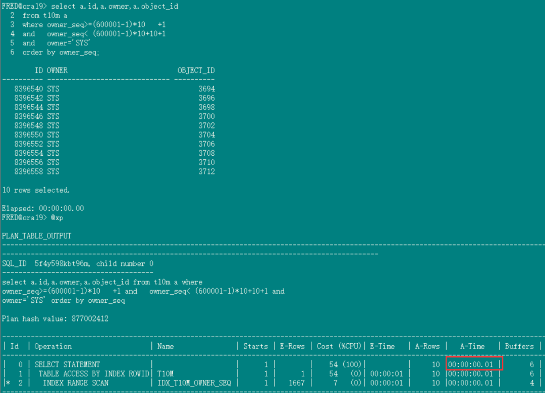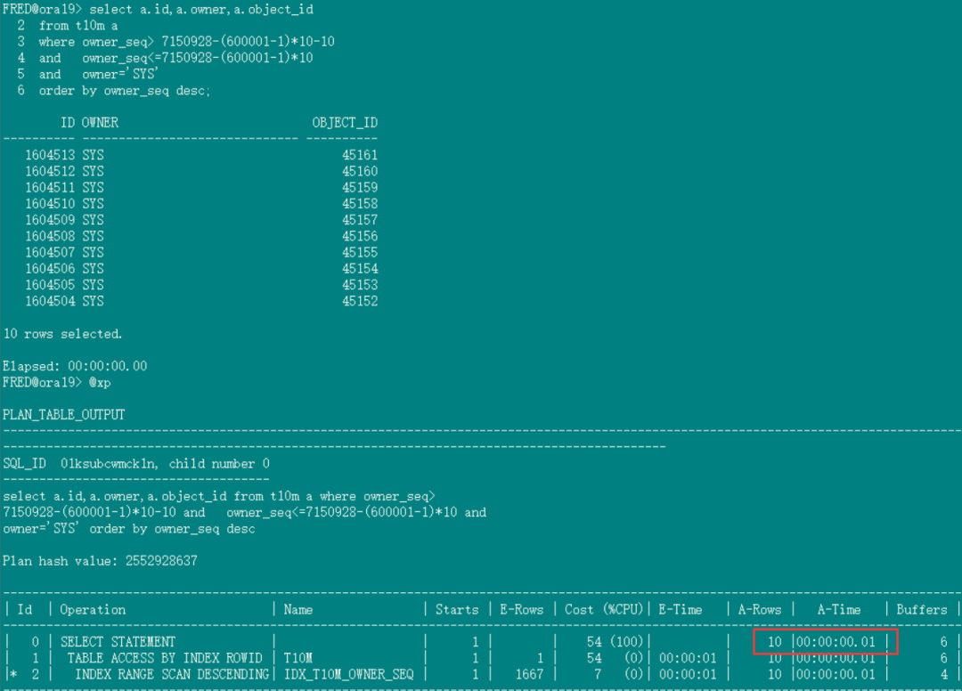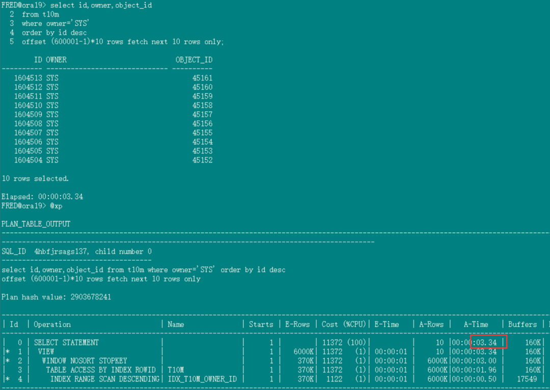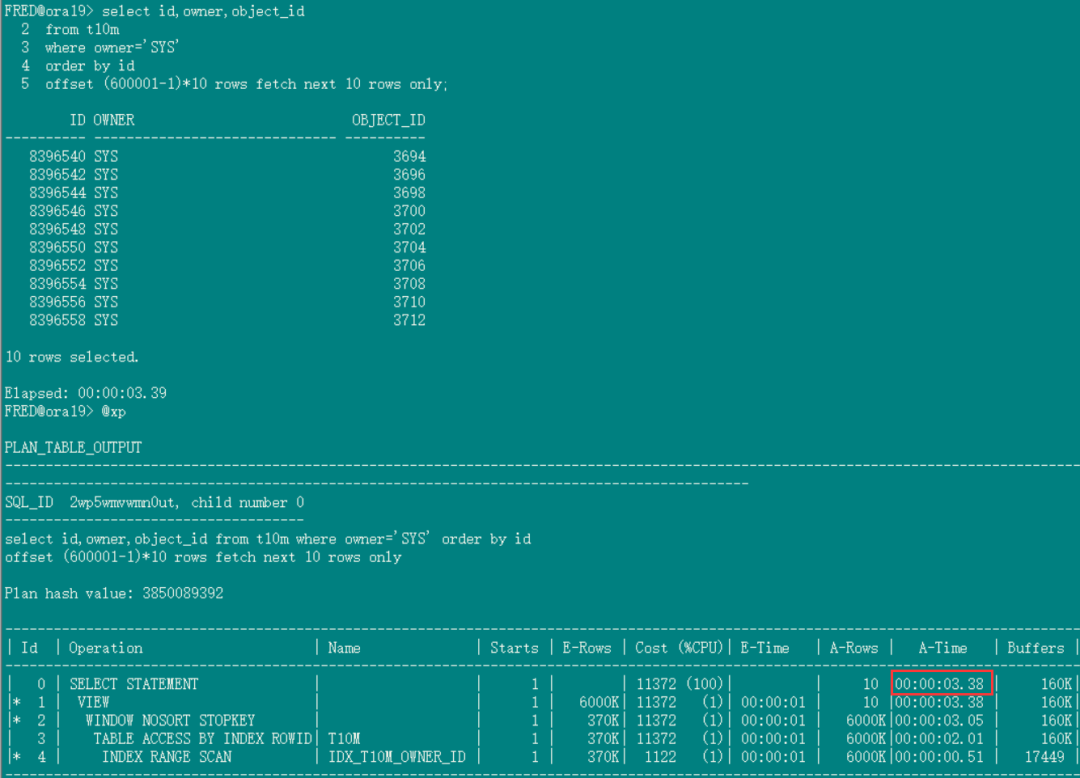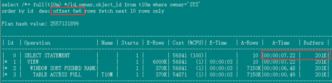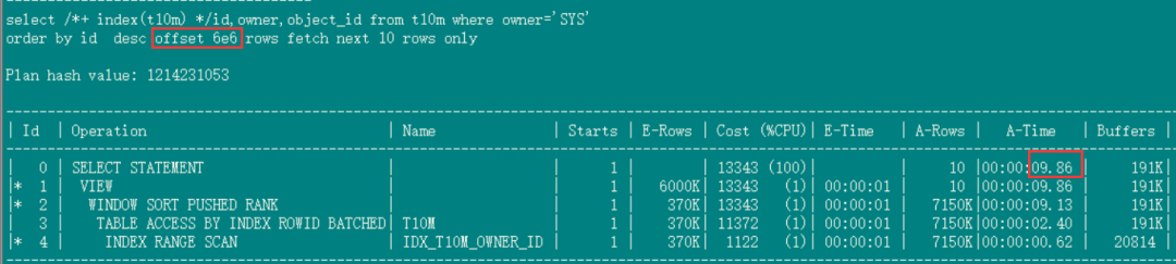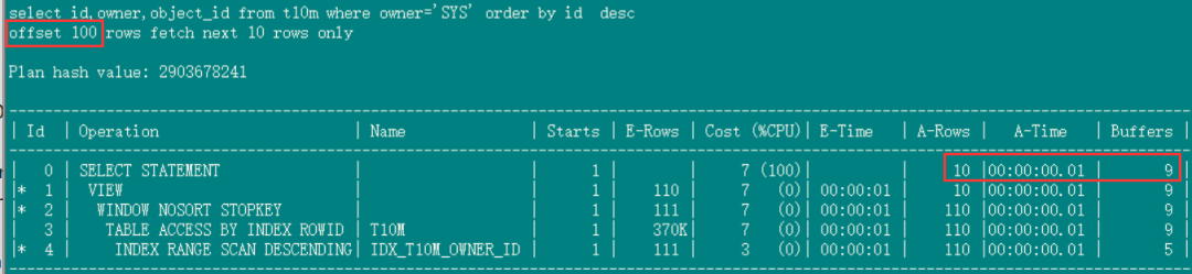 select id,owner,object_id from t10m where owner='SYS' and id<=10000000 order by id desc fetch next 10 rows only;