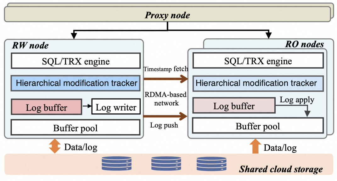 实现从库的强一致性一直以来都是数据库业内难以突破的技术难题,本次入选VLDB工业赛道的阿里云论文《PolarDB-SCC: A Cloud-Native Database Ensuring Low Latency for Strongly Consistent Reads》颠覆了传统的主从复制架构,提出了一种全新的数据库架构。新架构利用RDMA的多种算子全面重构了主从节间的数据通信模式,通过追踪细粒度的数据修改以及设计新的时间戳方案,并融合基于时间序的新一代事务系统实现了高性能全局一致性读。目前该架构已在PolarDB上线,PolarDB是业内首个在业务无感知情况下实现全局一致性读的主从架构云原生数据库,解决了海量客户的一致性痛点。