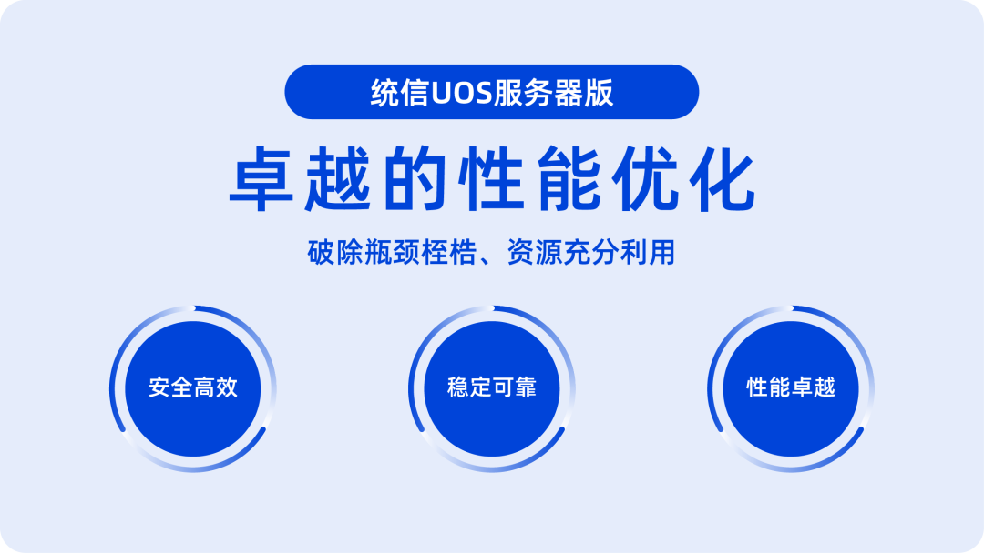 统信UOS服务器版在充分保障安全性、稳定性的同时,极度重视系统性能的调校,通过引进国内外知名且成熟的技术与工具,从对系统在人工智能、大数据、云计算、Web服务、容器等各应用场景中各项性能数据分析的基础上,基于“破除瓶颈桎梏、资源充分利用”原则,对系统性能给予最大化调优。