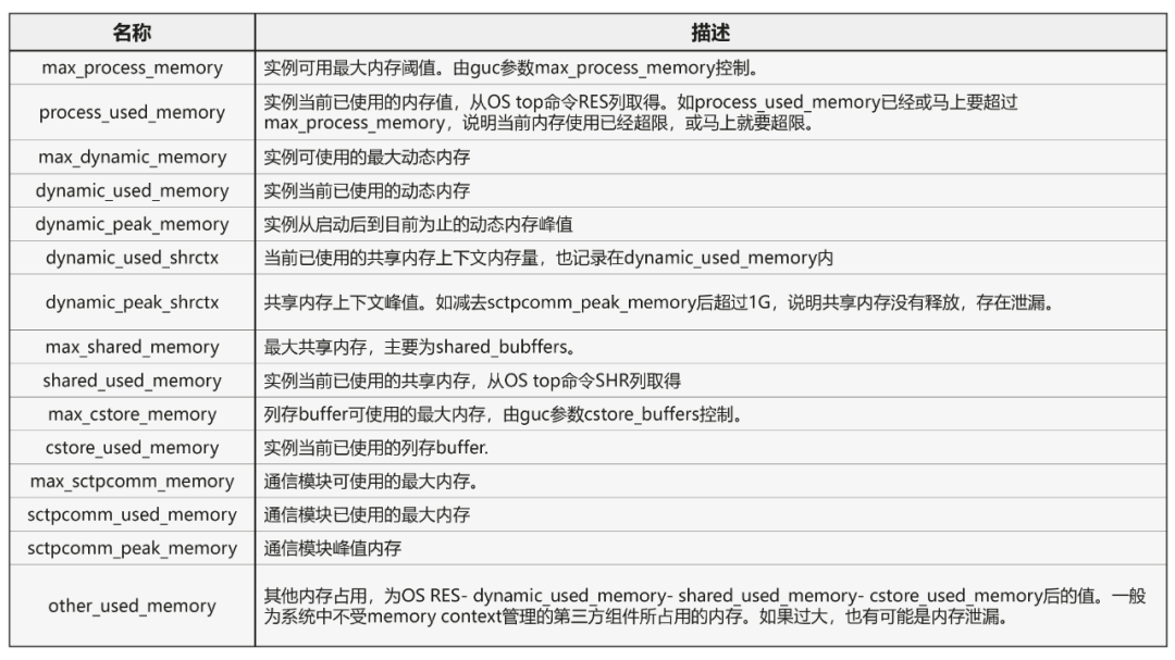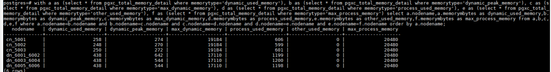 with a as (select *from pgxc_total_memory_detail where memorytype='dynamic_used_memory'), b as(select * from pgxc_total_memory_detail wherememorytype='dynamic_peak_memory'), c as (select * from pgxc_total_memory_detailwhere memorytype='max_dynamic_memory'), d as (select * frompgxc_total_memory_detail where memorytype='process_used_memory'), e as (select* from pgxc_total_memory_detail where memorytype='other_used_memory'), f as(select * from pgxc_total_memory_detail where memorytype='max_process_memory')select a.nodename,a.memorymbytes as dynamic_used_memory,b.memorymbytes asdynamic_peak_memory,c.memorymbytes as max_dynamic_memory,d.memorymbytes asprocess_used_memory,e.memorymbytes as other_used_memory,f.memorymbytes asmax_process_memory from a,b,c,d,e,f where a.nodename=b.nodename andb.nodename=c.nodename and c.nodename=d.nodename and d.nodename=e.nodename ande.nodename=f.nodename order by a.nodename;