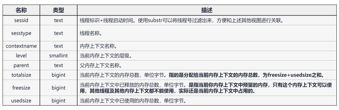 一般共享内存上下文分配和语句有关的, contextname都会带有线程号或者query_id,根据query_id或者线程号进行查杀异常sql,除此之外共享内存上下文一般是内核中各个模块使用的内存,比如topsql,需要排查内存使用是否合理,以及释放机制。