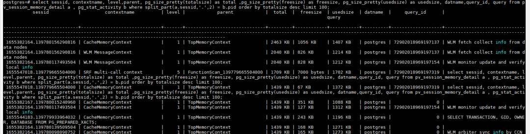 select sessid, contextname, level,parent, pg_size_pretty(totalsize) as total ,pg_size_pretty(freesize) as freesize, pg_size_pretty(usedsize) as usedsize, datname,query_id, query from pv_session_memory_detail a , pg_stat_activity b where split_part(a.sessid,'.',2) = b.pid order by totalsize desc limit 100;