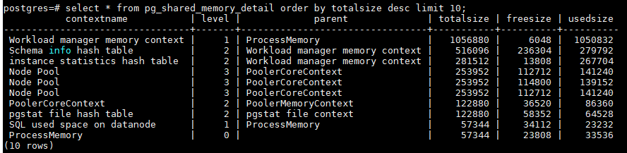 select * from pg_shared_memory_detail order by totalsize desc limit 10;