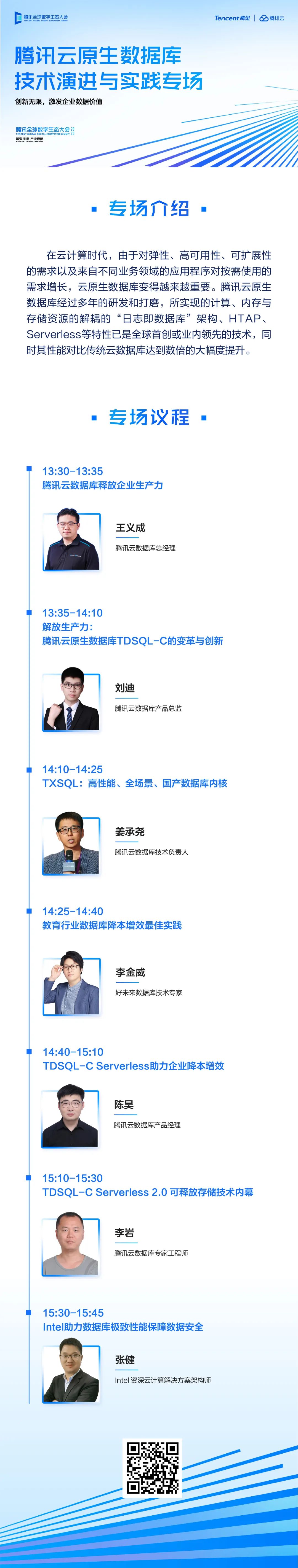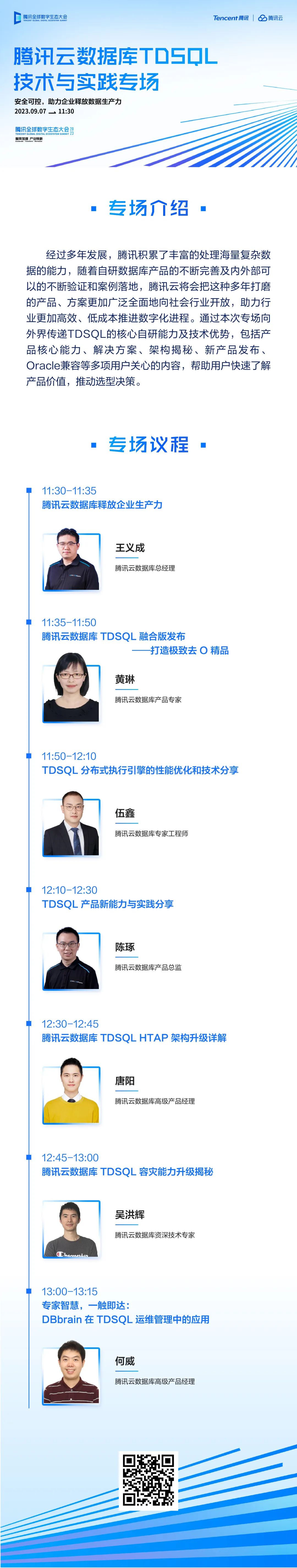 为方便小伙伴观看每一个数据库专场,实现错峰参会,在腾讯云数据库视频号等多媒体平台上,将于9月7日(本周四) 11:30对「腾讯云数据库TDSQL技术与实践专场」和「腾讯云原生数据库技术演进与实践专场」进行顺序直播,所有数据库爱好者均可免费报名参与。专场活动日程详见下方海报,您可点击预约按钮预约直播,或长按识别二维码报名。