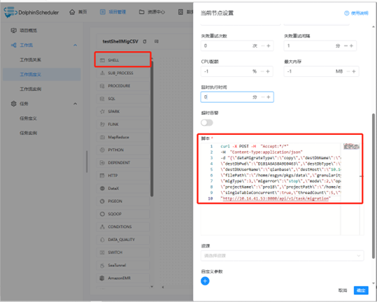 经测试,在海豚调度器界面中可以通过创建两种类型的工作流(SHELL及HTTP)来调度MT的API。SHELL方式中只需要设置相应的curl命令调度对接的HTTP接口并传递相应的参数即可完成调度工作,HTTP方式与SHELL类似,也是只需要指定HTTP地址并配置相应的请求参数即可。