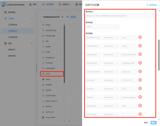 方便的API接口调用,使得QianBase MT能够非常方便的与外部调度系统对接,当前我们就测试了开源调度系统海豚调度器DolphinScheduler对接MT实现数据迁移入库。