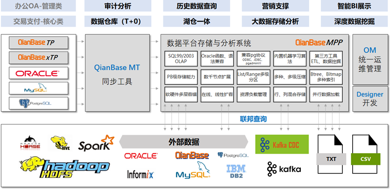 “使用QianBase MPP作为统一的数据仓库存储行内所有核心类业务系统交易数据,定时或实时抽取各系统增量数据,支撑不定时历史数据查询、分析,如查询某一客户、账户的数据在某一历史时间段内的变更过程,以及多个业务系统数据的关联统计分析。”---某农商行历史数据查询平台需求描述。