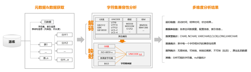 这个工具的原理很简单,首先是建立一个可以分析的字符集基线,比如GB系、Unicode系列等,其次是获取源数据库的元数据,包括字符集、索引信息、表结构信息(列类型、列长度)等,然后基于源数据库和目标数据库的字符集做好映射,最后再对数据库进行数据扫描和分析,输出多维度的分析评估报告。目前这个工具正在和某银行进行联创,从前期的试用效果来看,确实能发现很多问题,比如ZHS16GBK和AL32UTF8两种字符集混编、直接写入二进制格式导致数据乱码、ZHS16GBK字符集使用了大量生僻字等。