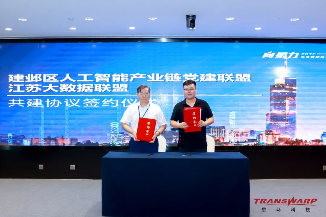 活动现场举行了南京市建邺区人工智能产业链党建联盟*江苏大数据联盟共建协议、星环科技*南数研究院战略合作两大签约仪式。