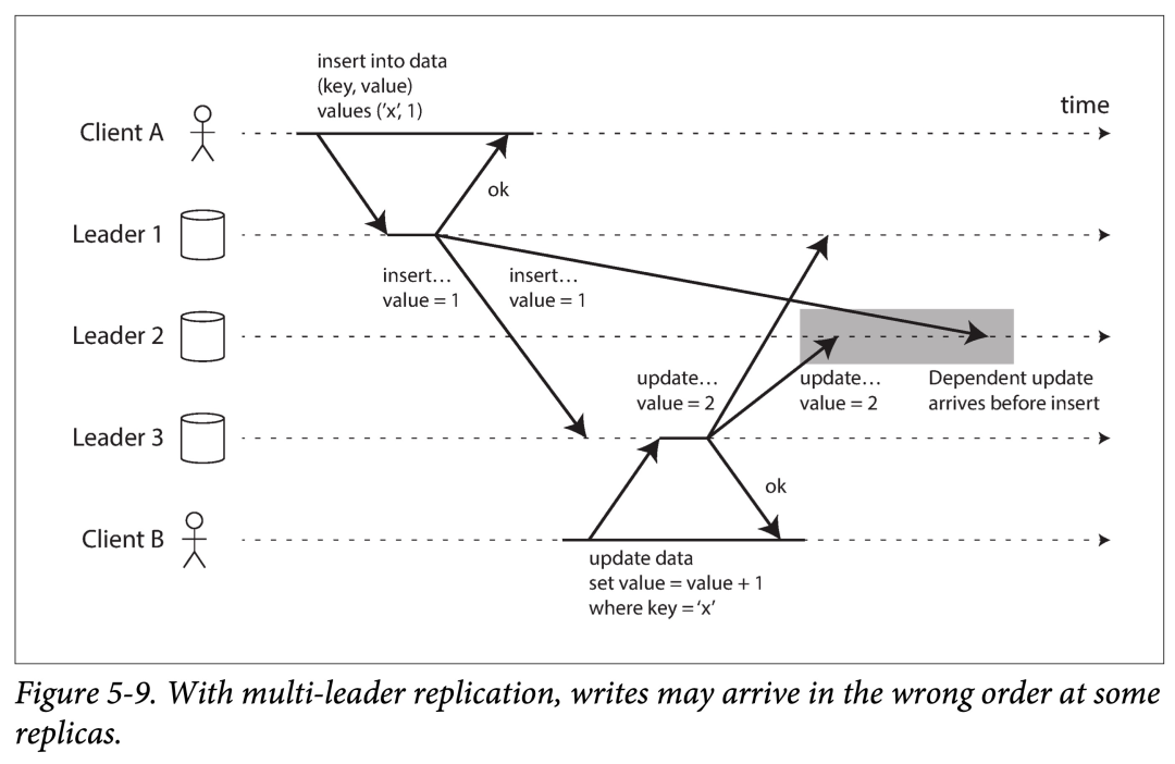两个有因果依赖的(先插入,后更新)的语句,在复制到 Leader 2 时,由于速度不同,导致其接收到的数据违反了因果一致性。