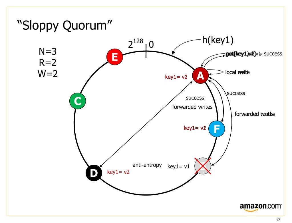 后者被认为是一种宽松的法定数目 (sloppy quorum):写和读仍然需要 w 和 r 个成功返回,但是其所在节点集合可以发生变化。