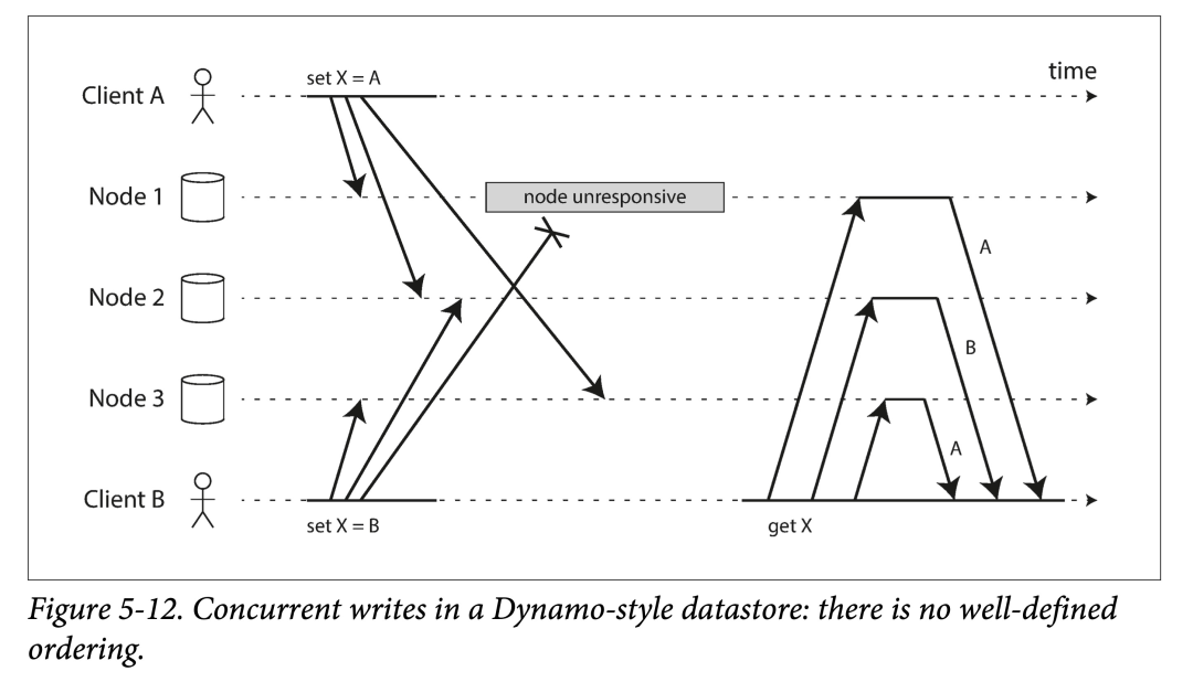 由于 Dynamo 允许多个客户端并发写入相同 Key,则即使使用严格的 Quorum 读写,也会产生冲突:对于时间间隔很短(并发)的相同 key 两个写入,不同副本上收到的顺序可能不一致。
