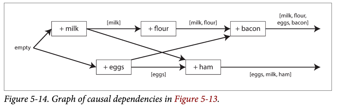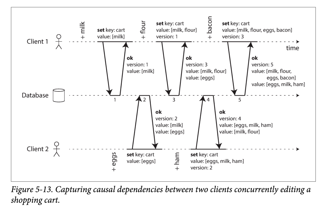 上图中的数据流,如下图所示。箭头表示 happens-before 关系。本例中,客户端永远没办法完全获知服务器数据,因为总有另外的客户端进行并发操作。但是旧版本的值会被覆盖,并且不会丢失写入。