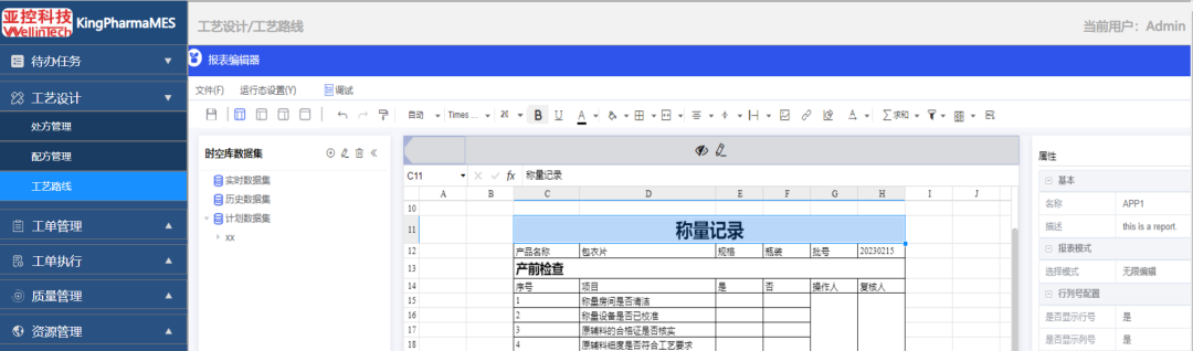 药品生产的执行依据:产品提供处方管理、配方锁定、工艺路径和报表记录功能。通过权限分配,只有审批通过的处方才能进行生产作业,并使用流程图可视化展示工艺路径及节点操作步骤,个性化配置每个工艺节点的操作记录,最终实现有据可依的要求。