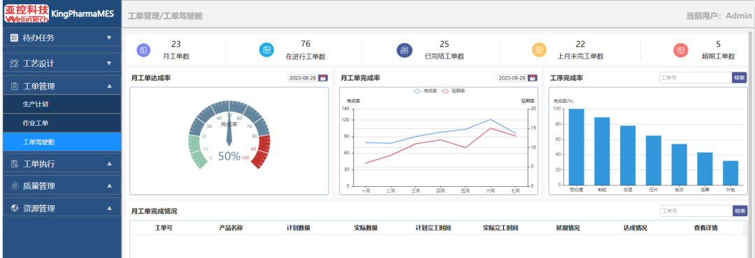 药品生产的作业计划:产品通过制定企业可批量生产的药品数量的厂级生产计划,以及将生产计划拆分为多个批生产指令单,并且可通过驾驶舱模式对作业工单进行多维度的可视化分析。