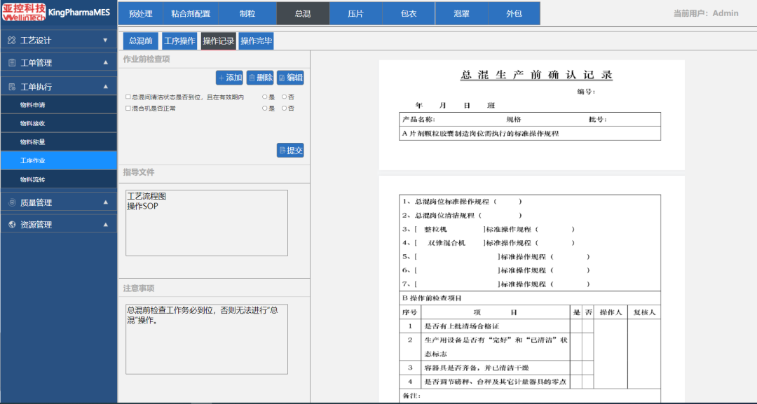 药品生产标准化作业:产品通过物料获取、物料称量、工序执行和物料流转四项标准化程序,确保作业前检查和作业操作严格按规定执行,避免“跳跃”、投料防错、中转防错等问题。最终操作完成后,实现电子记录同步生成效果。