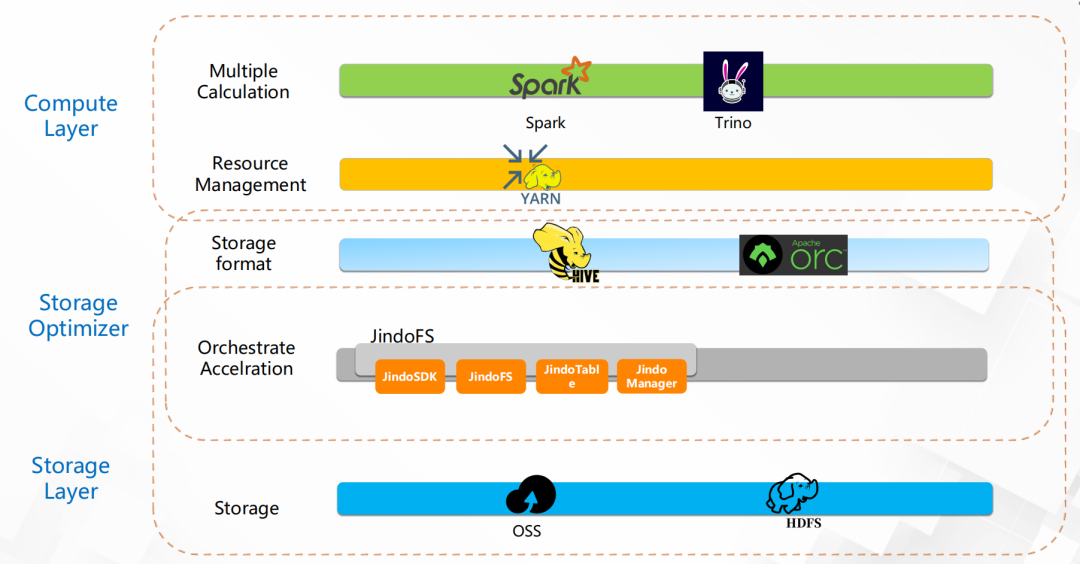 如上图所示,我们的数据仓库 Hive 集成了阿里云 Jindo SDK,底层使用 OSS 存储海量数据。计算引擎我们采用了 Spark,通过在其上方构建了 Kyuubi 网关,实现了多租户和资源隔离,从而进一步优化了计算资源的利用;即席查询,我们选择了 Trino(原 Presto)作为执行引擎;主要的数据治理和开发工作则是使用了 SparkSql+UDF/UDAF。