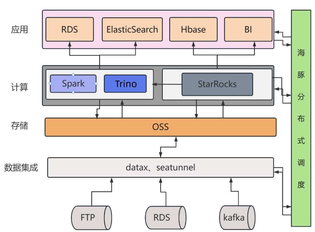 原先的大数据平台涵盖了许多组件,如 Spark、Yarn、Hive、Trino、Zookeeper 和 HDFS 等,复杂的架构加上人力的紧张,整个系统的维护变得异常复杂和繁琐,令人应接不暇。然而,引入 StarRocks 后,整个架构得到了显著简化。StarRocks 仅包括 FE 和 BE 这两个核心组件,并且在存算分离版本中,只依赖一个外部对象存储服务(例如 OSS)。相比存算一体架构,存算分离架构也并未引入额外的组件,运维起来极其方便。