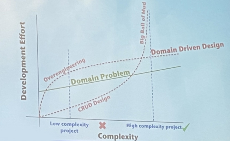 值得一提的是,CRUD和DDD会有一个交叉点,而业务最终的演进方向一定会向复杂的方向发展。尤其是互联网项目,开始只是做一些简单的业务逻辑实现,之后随着业务的发展,会变得越来越复杂,传统开发方式就会变得艰难。