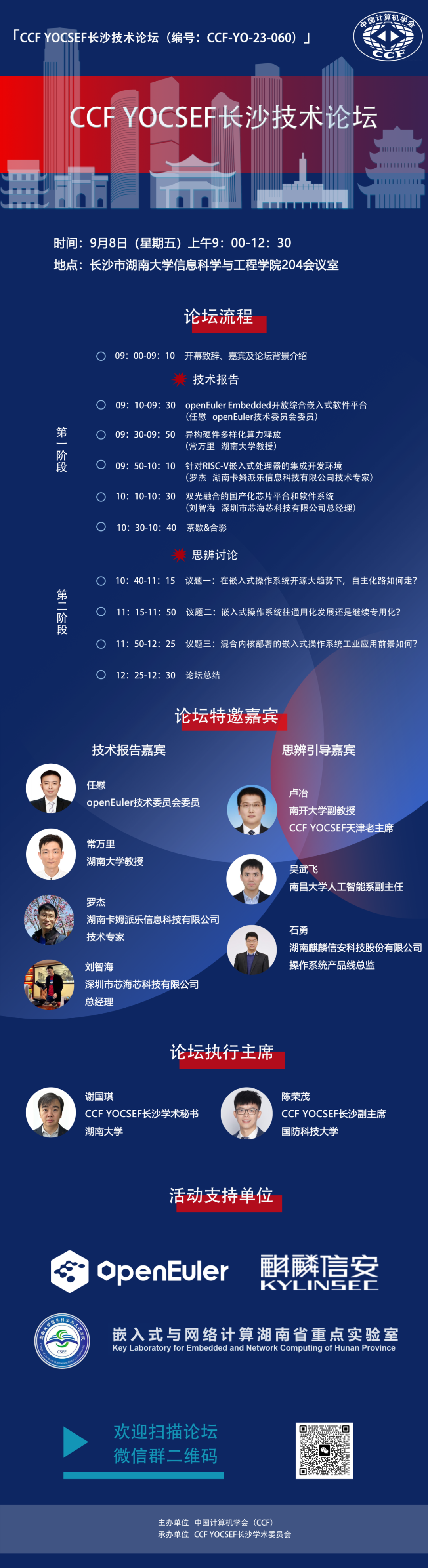 9月8日,由openEuler社区、CCF YOCSEF长沙、麒麟信安、湖南欧拉生态创新中心、湖南大学信息科学与工程学院、嵌入式与网络计算湖南省重点实验室联合组织的2场嵌入式技术活动将在湖南大学举办,在此为大家献上活动指南,快来与优秀的开发者和行业专家共同探索开源技术和嵌入式技术的未来。