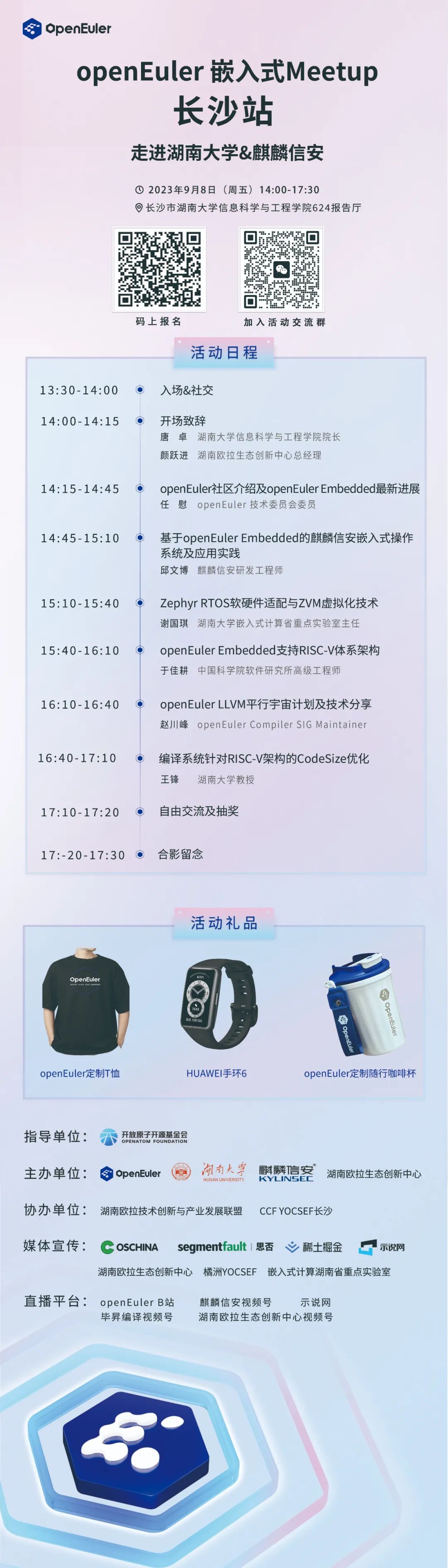 2 | openEuler嵌入式Meetup长沙站:走进湖南大学&麒麟信安 | 9月8日 下午13:30 | 湖南大学信息科学与工程学院624报告厅 |