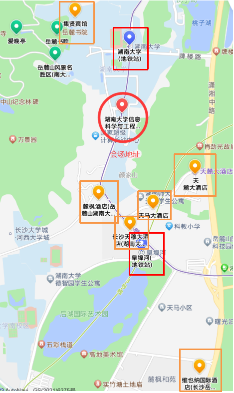 会议地址为湖南大学信息科学与工程学院,位于湖南大学地铁站与阜埠河地铁站之间。为了节省买票时间、方便出行,建议提前下载“湘行一卡通”APP或者“长沙地铁”APP,地铁、公交均可使用。可使用高德地图、百度地图等导航系统查询如何到达湖南大学信息科学与工程学院,具体地址为长沙市岳麓区麓山南路2号。