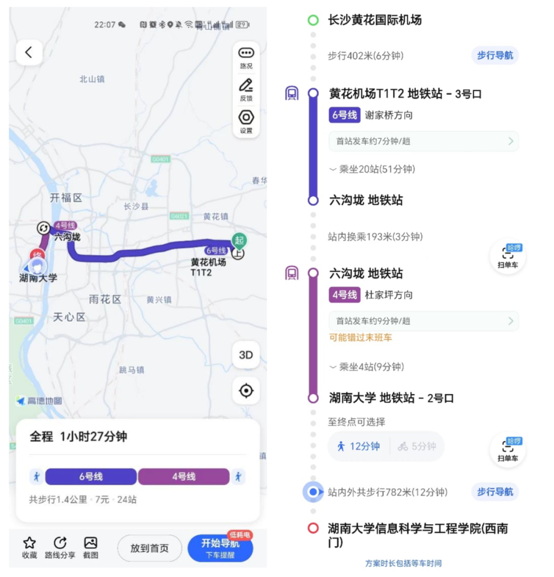 乘车方案二:地铁6号线转4号线(约1小时27分钟)