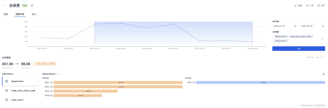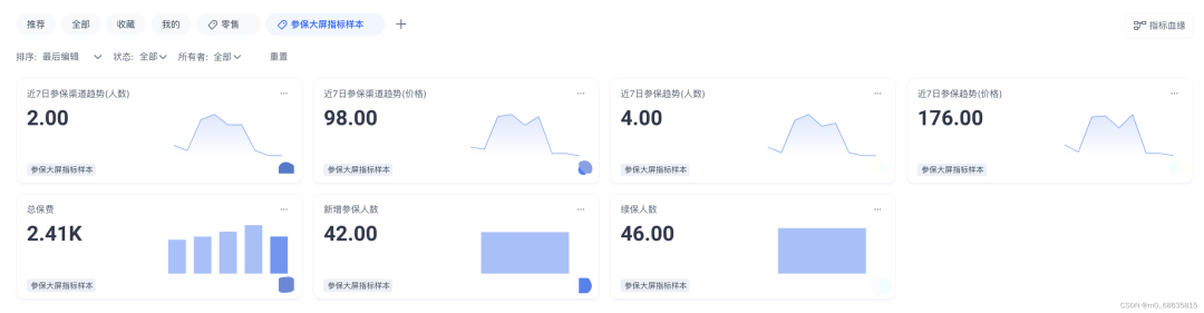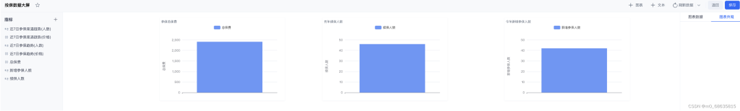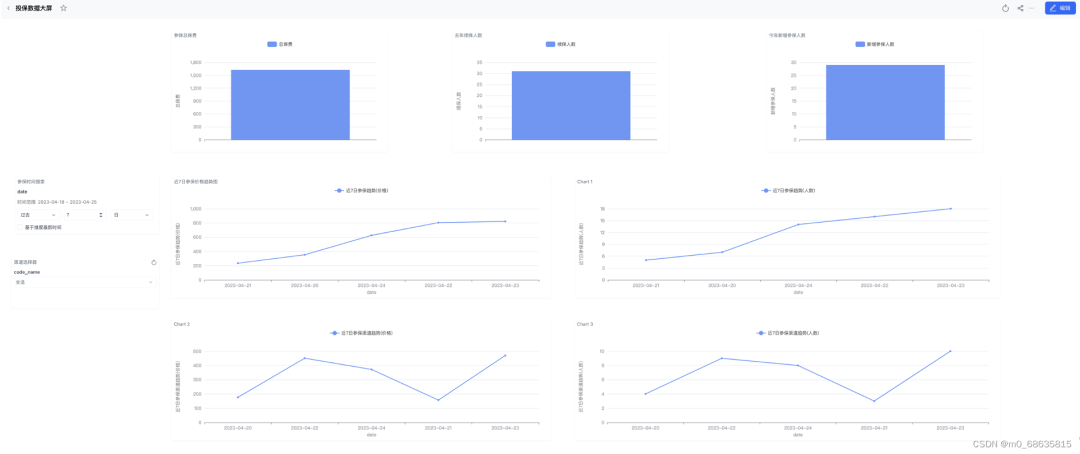 仪表盘可以直观的看到,公司的参保总保费、续保人数(二次购买)、新增参保人数的销售情况。同时,可以根据筛选器,周期性的了解,如近 7 日,总的参保价格、总的参保人数、渠道的参保价格、渠道的参保人数的变化,客群可持续的粘性度。