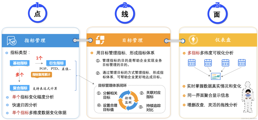 通过对 Kyligence Zen 产品进行简单的指标、目标、仪表盘的配置,就可以实现一个低成本、高效率、轻量的、开箱即用的最小可用的指标分析和管理应用。