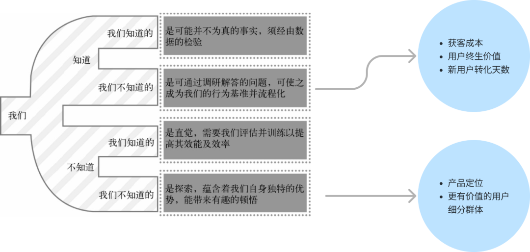 在这个图里,上面的:获客成本、用户终生价值等指标,属于我们知道我们不知道的,属于报告性指标,需要做数据的获取与维护,而下方的:产品定位,更有价值的用户细分群体,属于不知道我们不知道的,需要企业家、分析师的不断思考与探索。