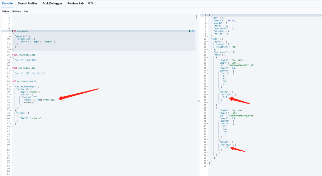 这是Painless脚本的关键指令。它将指定的值输出为运行时字段price_a的值。